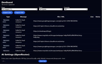 En av de mest framstående funktionerna är den AI-drivna felbeskrivningen via OpenRouter, som ger djupare insikter om varje fel. Användare kan få klara förklaringar, troliga orsaker och rekommenderade lösningar. DevGuard prioriterar integritet och säkerhet, då ingen personlig data samlas in eller delas, och all information lagras lokalt i webbläsaren. Med en modern och användarvänlig design är DevGuard ett värdefullt verktyg för alla som arbetar med webbutveckling.